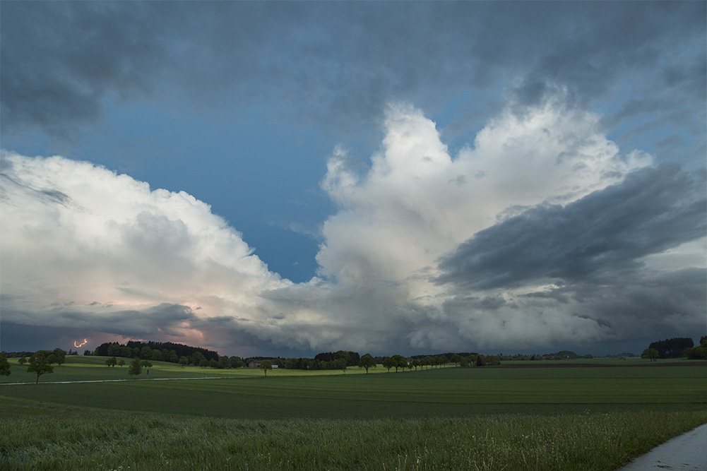Am Nachmittag bildete sich von Memmingen bis Augsburg eine Gewitterlinie. Aus der Ferne konnte man beeindruckende Quellungen beobachten. Bei Memmingen war ein Gewitter abgelöst von der Linie. Die Gewitter lösten sich dann aber recht schnell wieder auf. Am Abend bildete sich dann ein Gewitter südlich von Landsberg. Bei Lengenfeld gabs Graupel und einen schönen Regenbogen. Später zog auch über Weilheim noch ein Gewitter.